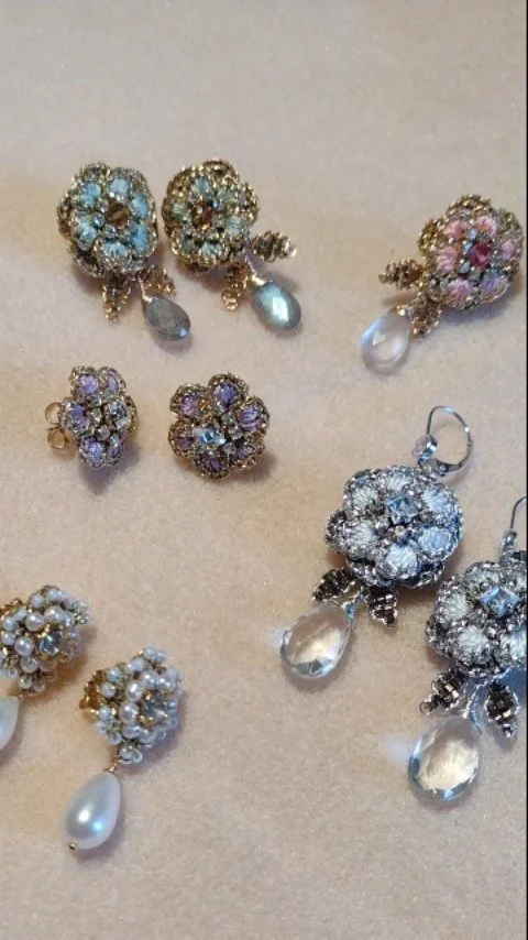 The lace is created with either pure silk, real metal, or metallic foil threads. Real metal threads are wrapped in a fine metal sheet containing amounts of gold or silver, and are nearly identical to those used in the rich embroidery and laces of the Renaissance and Rococo eras. The metallic foil threads are used in traditional Japanese embroidery and contain .999 silver and 18k gold in the foil. All designs are finished with sterling silver or 14k gold-filled findings.